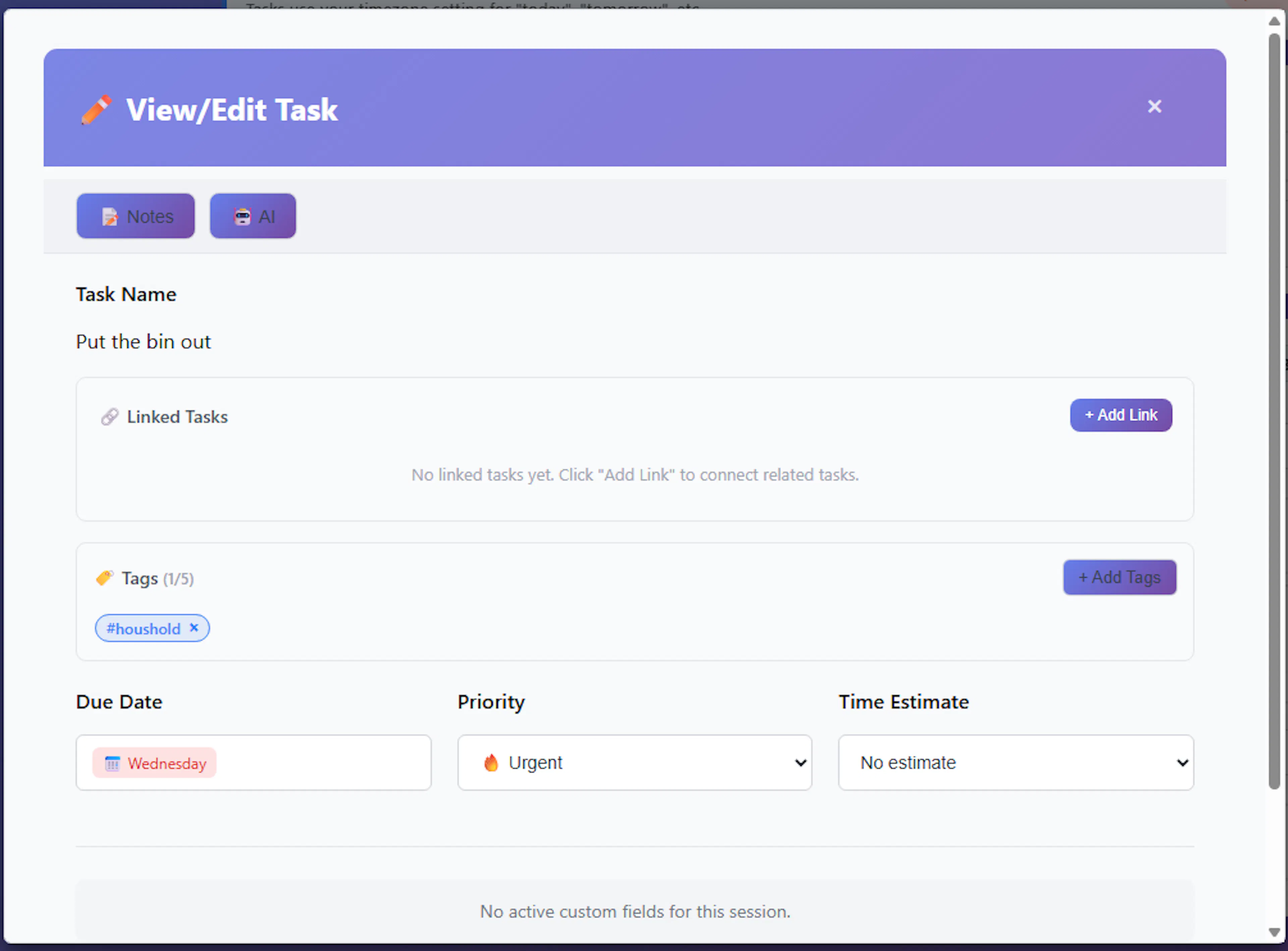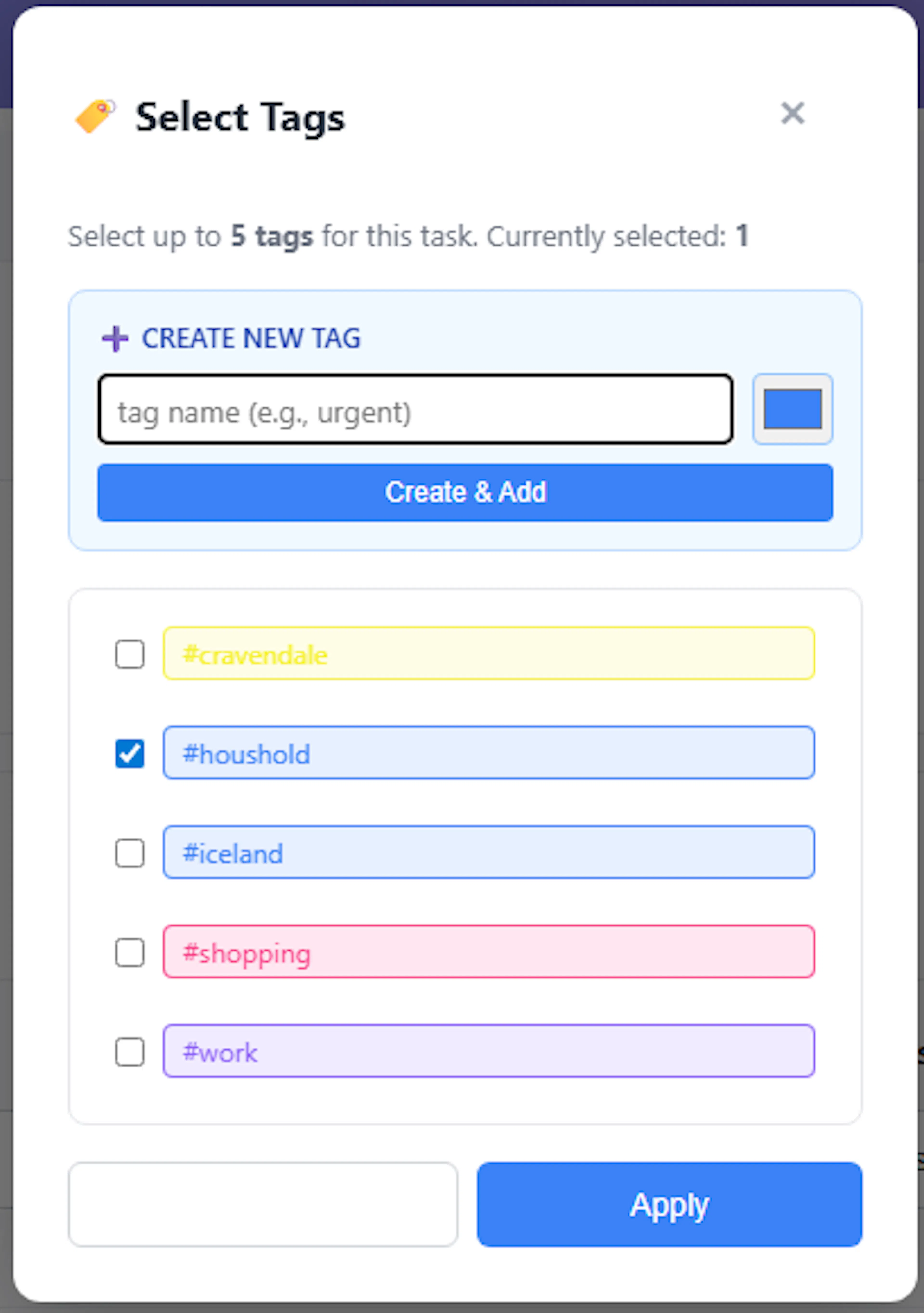 Usage Count: A highly useful badge showing exactly how many active tasks are currently associated with this tag (e.g., "5 tasks").