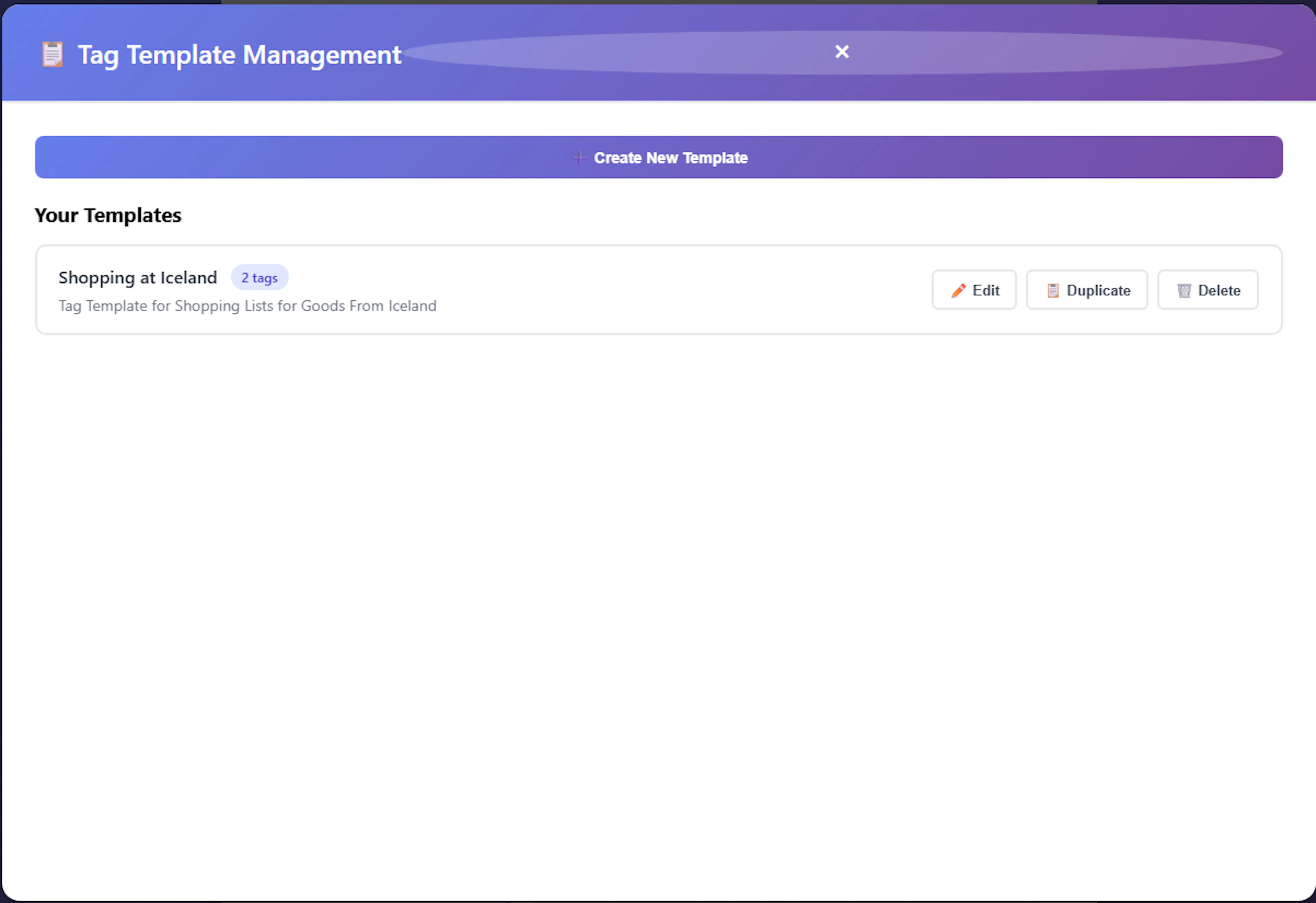 Duplicate a template: If you want to create a new template that is only slightly different from an existing one, click the 📋 Duplicate button. This will open a new template form with the exact same tags pre-selected and "(Copy)" appended to the template name, saving you setup time,.
