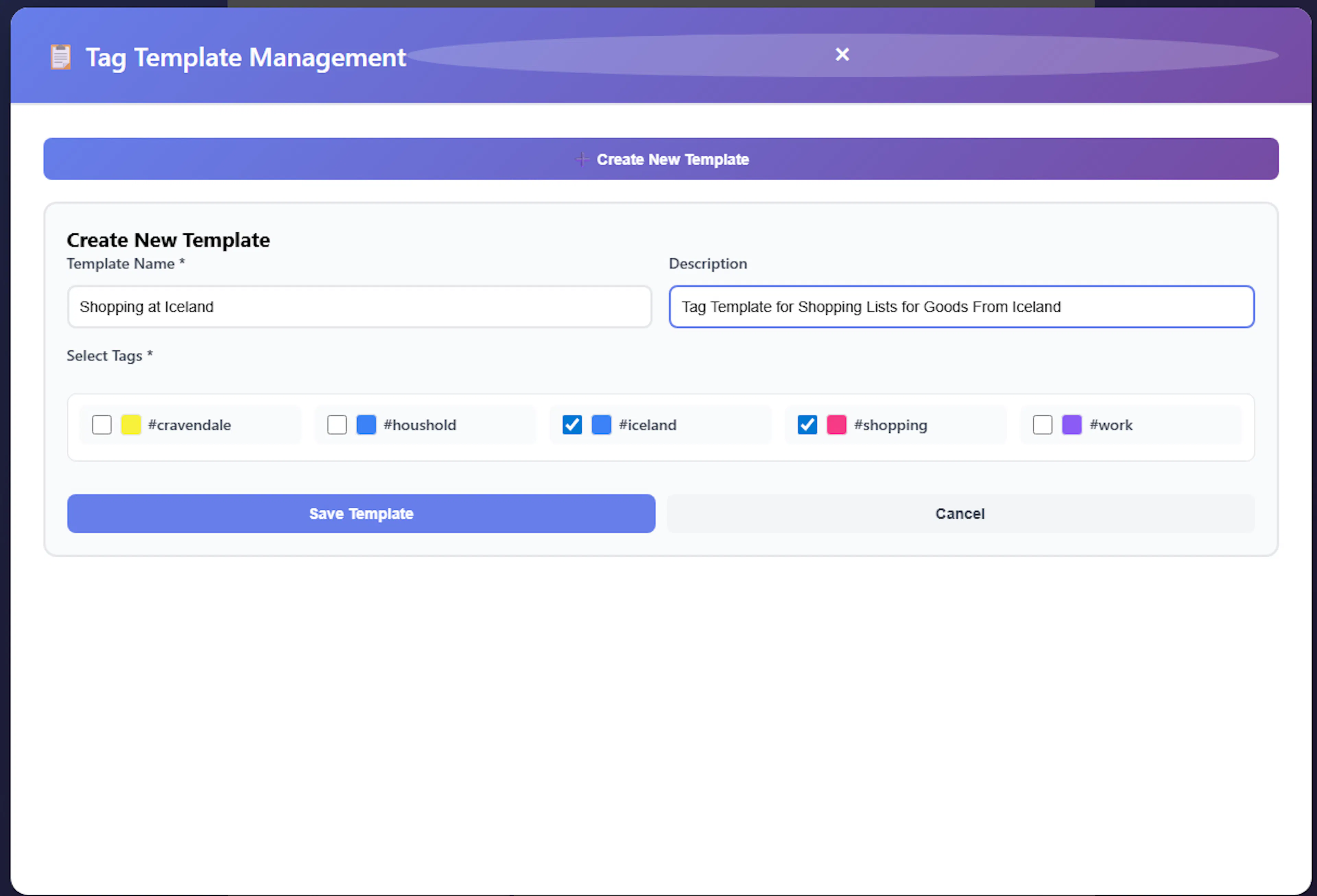 - Create a new tag template: Click the "Create New Template" button. You will be prompted to enter a Template Name, an optional Description, and select the specific tags you want to group together using the provided checkboxes,. Once selected, click "Save Template" to store it