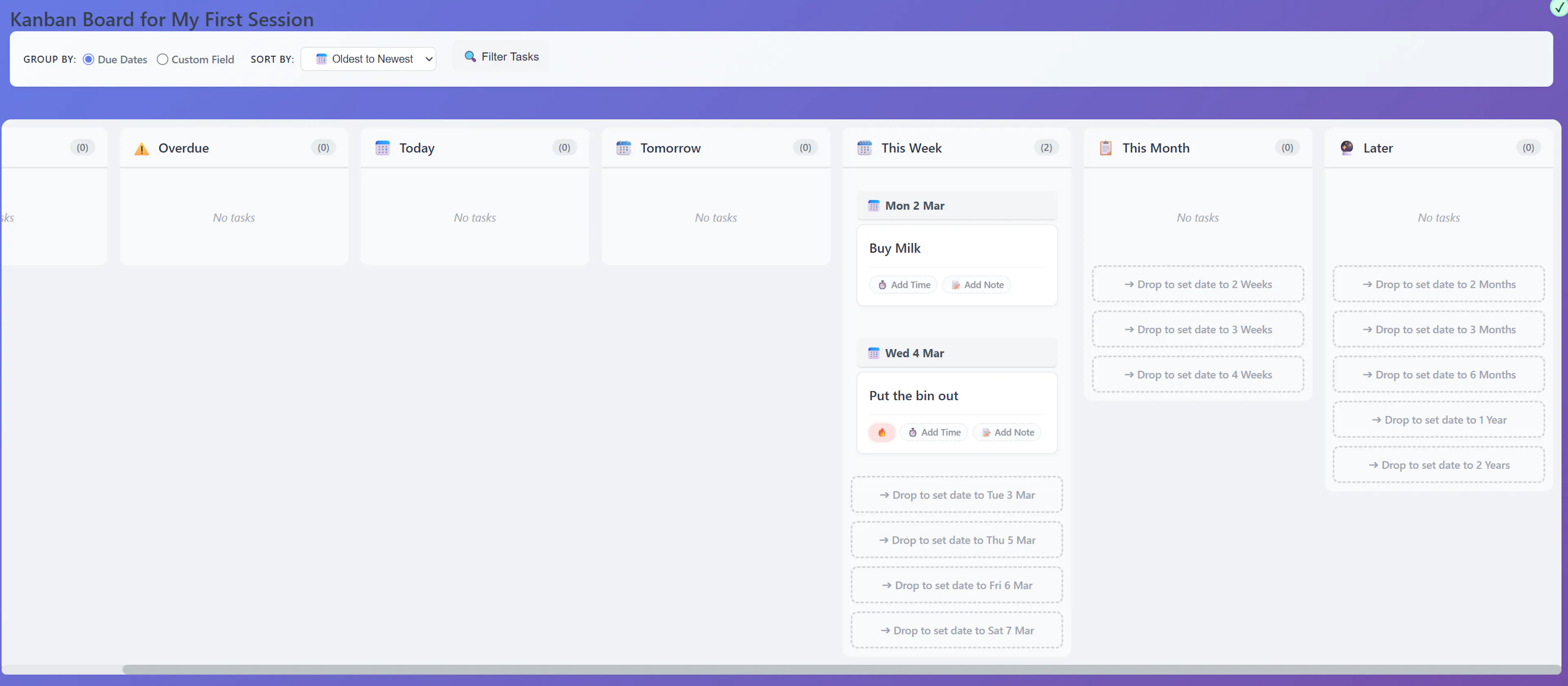 By default, the Kanban board acts as a tactical time-management tool. It automatically generates columns based on your timeline: Overdue, Today, Tomorrow, This Week, This Month, Later, and No Date.