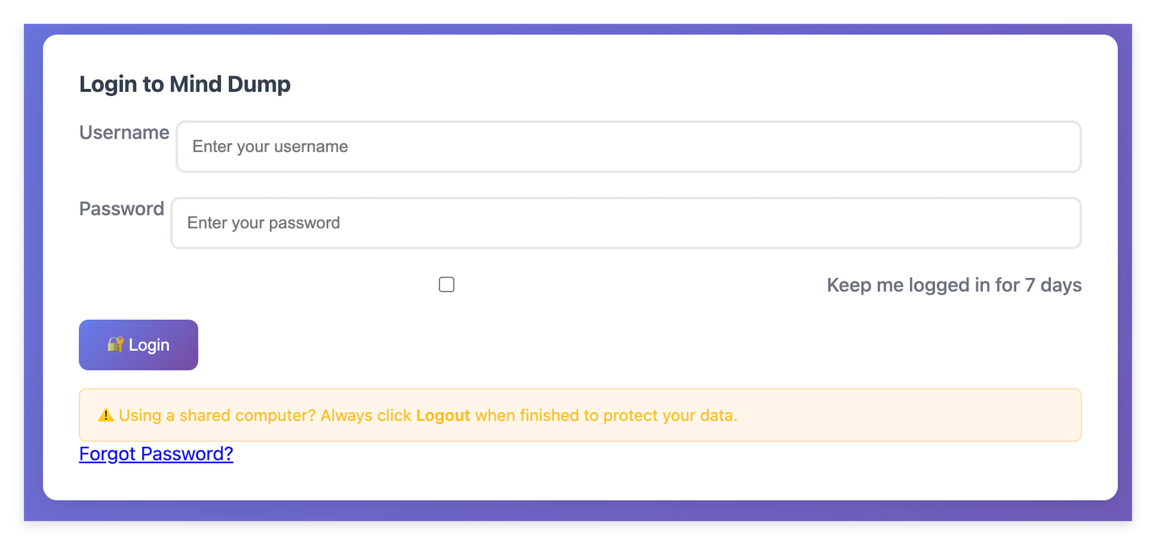 Welcome to Mind Dump! This guide will take you step-by-step from your very first login to creating your first task, giving you a quick tour of the workspace along the way.