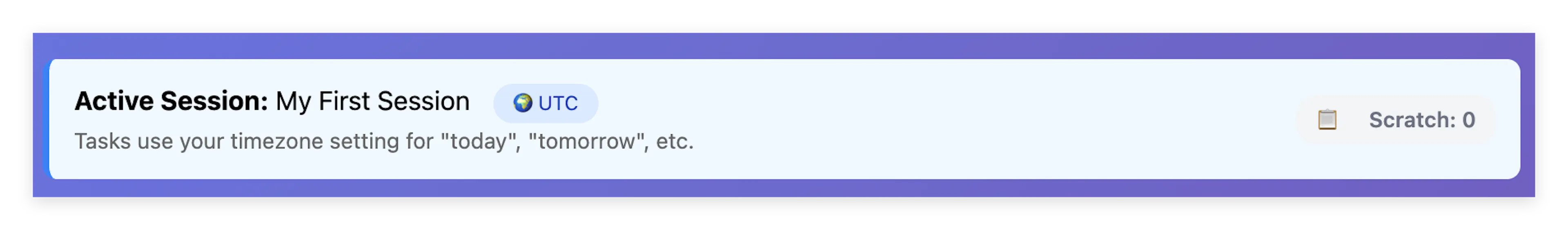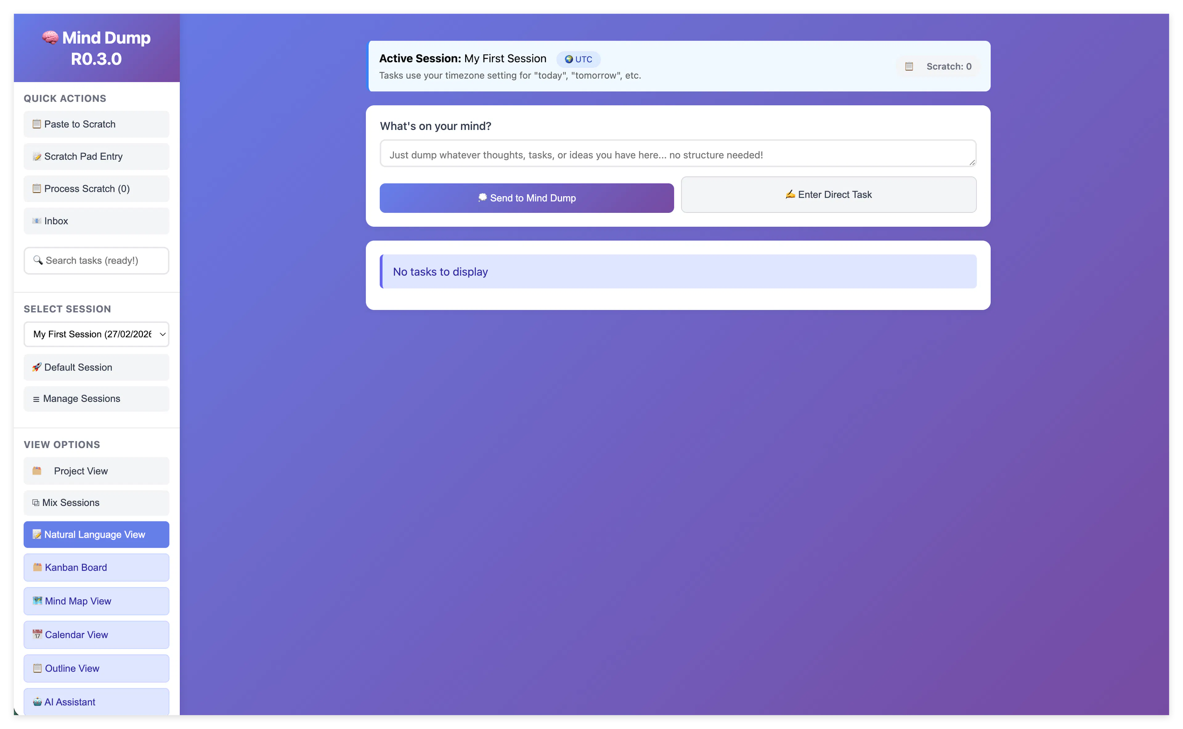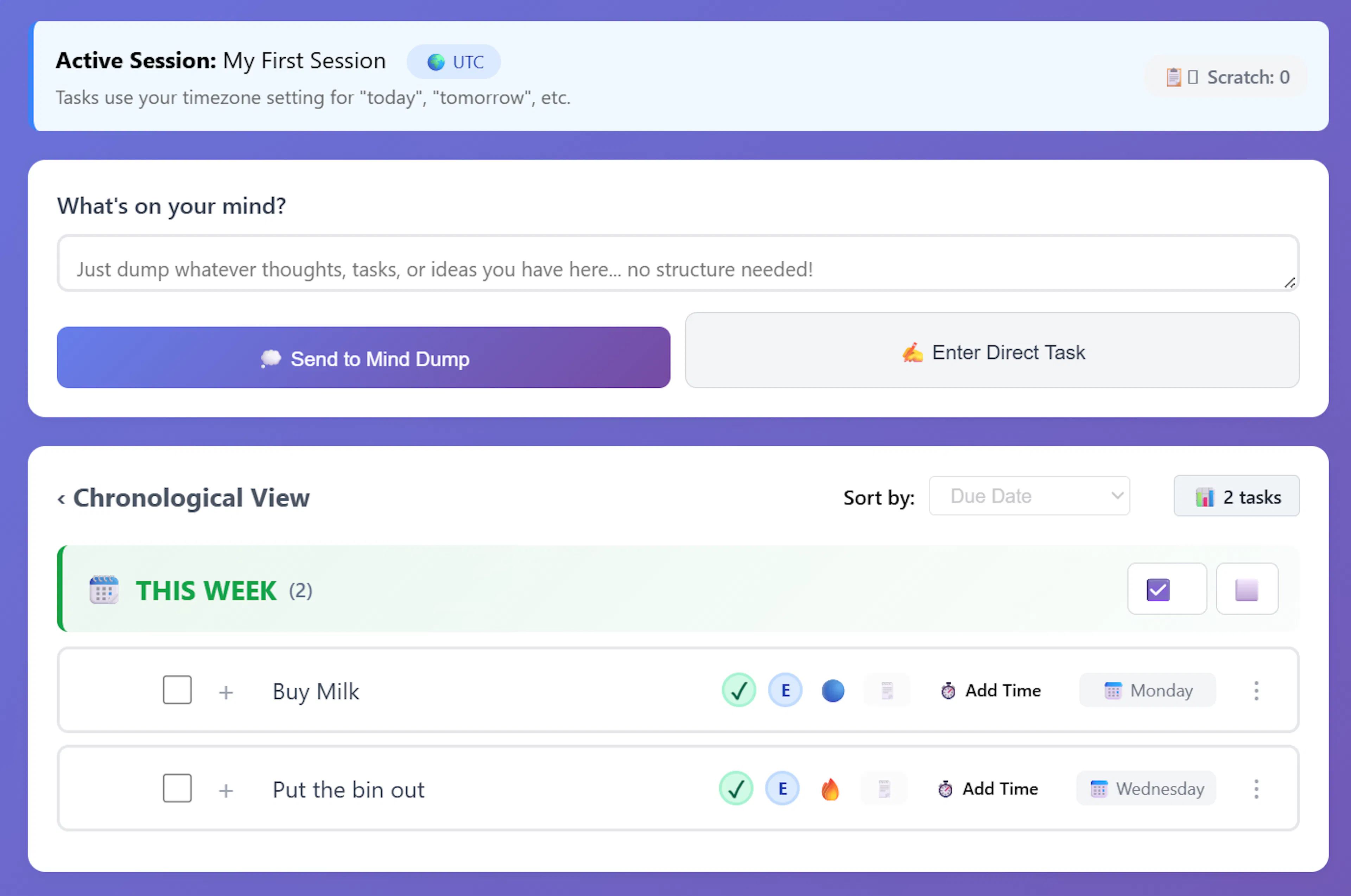 This initial session is created as a basic Date Centric session. "Date Centric" simply means that the session will be ordered and managed by time. This structure is incredibly useful for standard task management functions or any workflow where dates and deadlines are an essential part of the process. (Note: Mind Dump supports several other powerful session types—we invite you to look at the dedicated documentation explaining Sessions to learn more Click Here).