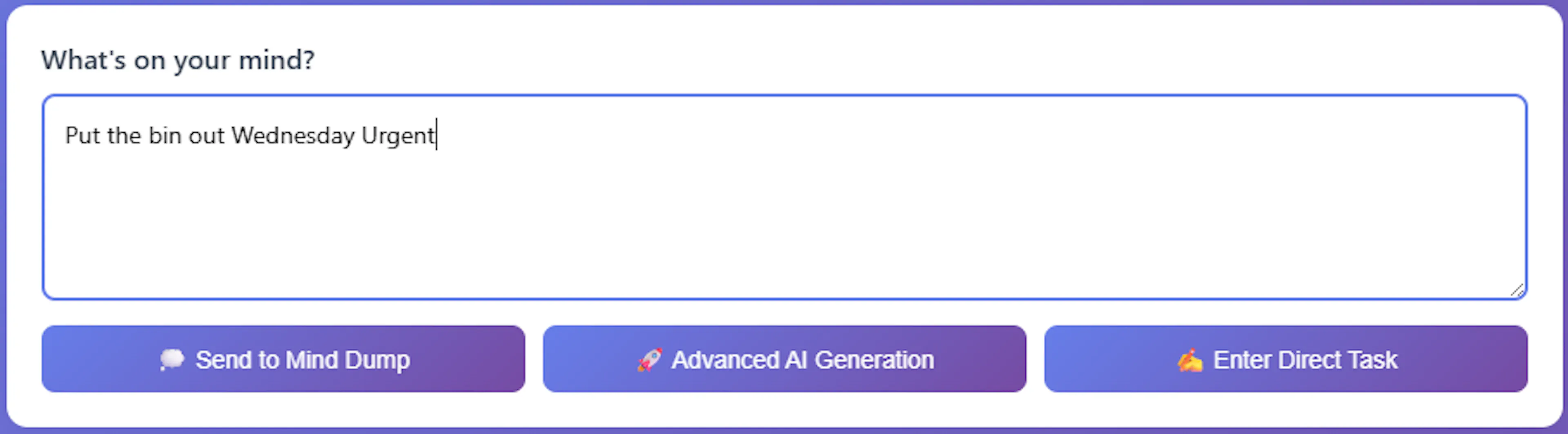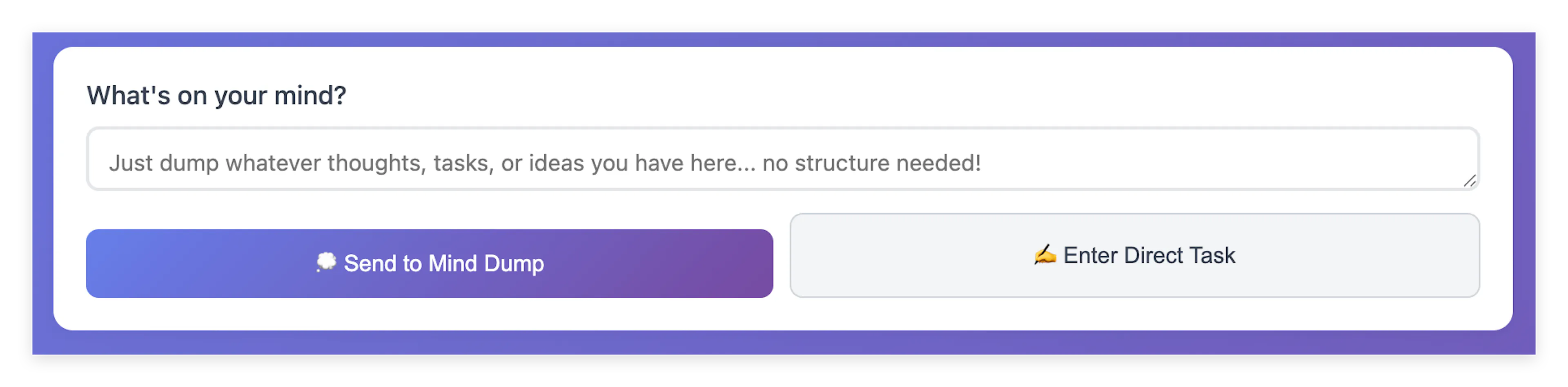 A "Send To Mind Dump" button, which processes the text you typed using the AI assistant.