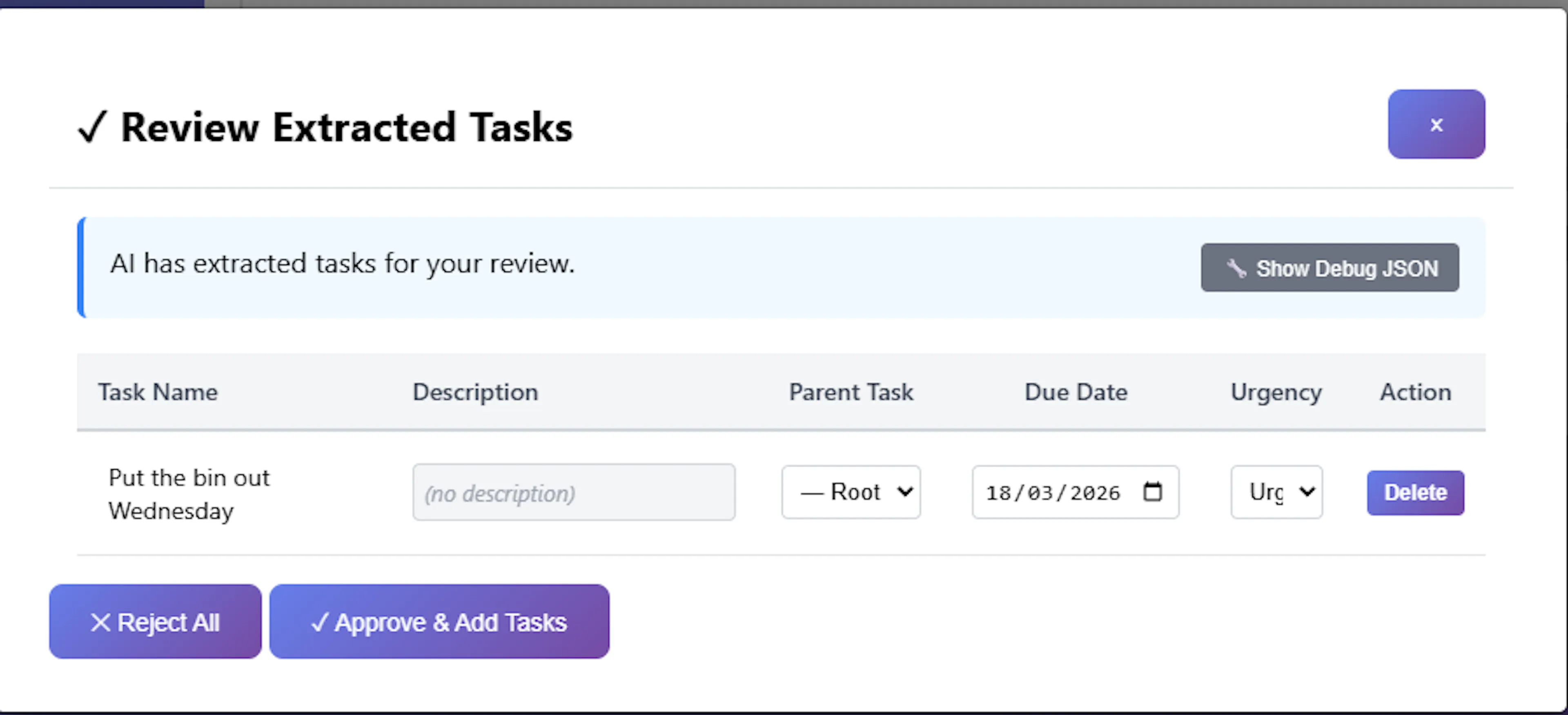 Date & Urgency: You can manually override the AI's interpreted Due Date or Priority Level using the inline selector fields.